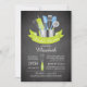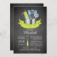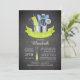 Estoque moderno o chá de panela da cozinha com uma tigela misturadora cheia de ferramentas retro verdes e azuis da cozinha, destacadas com uma faixa verde moderna e colocadas sobre um fundo preto de quadro negro contemporâneo. Visite o nosso compro para ver o convite do nosso chá de casamento de utensílios na moda numa variedade de cores de casamento populares.