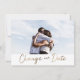 Anuncie que seu casamento foi adiado para futuros convidados com estes cartões de alteração de data. Com a sua foto e "altere nossa data" em letra dourada falsa. Personalize com sua foto e detalhes do casamento.