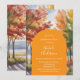 Uma pintura aquosa de uma paisagem de outono com um caminho de sujeira passando por árvores coloridas. As árvores à esquerda têm folhas vermelhas e laranja profundas, enquanto as árvores à direita se transitam de amarelo para verde. Um pinheiro azul alto fica na distância média. O caminho é pintado em tons castanhos quentes com folhas laranja caídas espalhadas ao longo dele. O plano de fundo apresenta colinas em tons azuis e roxos silenciados. O céu está pintado em lavagens brancas e azuis, criando uma atmosfera pacífica de outono. A grama ao longo do caminho é renderizada em vários tons de verde e ouro. A pintura tem um estilo flexível e expressivo típico de técnicas de aquarela, com pinceladas visíveis e hemorragia colorida. A composição é equilibrada com as árvores que criam linhas diagonais fortes que vão do primeiro ao segundo plano. A paleta de cores é composta por vermelhos, laranjas, amarelos, verdes, azuis e castanhos, capturando a essência de um dia de queda.