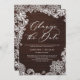 Mude a data! Anuncie para sua família e amigos o adiamento do seu casamento com este cartão de anúncio de casamento rústico. Ele apresenta renda antiga floral e folhagem em fundo de madeira falsa com padrão de renda correspondente. Personalize adicionando seus nomes e outros detalhes. Este cartão de cancelamento de casamento com renda floral também será perfeito como um anúncio de fuga.