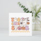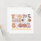 Design de Halloween bonito, colorido e divertido, com um fantasma com chapéu de bruxa e abóbora, vários jack ou lanternas, e texto de lavanda, amarelo, rosa, laranja e branco que diz Muito bonito de se assustar!