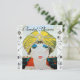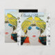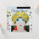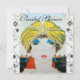 Vibrante, estilizada ilustração Art Déco francesa de alta moda com espirais geométricas, círculos. Retrato de uma linda jovem elegante usando um chapéu oriental amarelo com penas em preto, branco, amarelo, cores azul e vermelho. Convite de festa moderno, artístico e sofisticado.