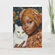 Um retrato cativante de uma jovem africana em um embrulho de cabeça de padrão vibrante, segurando suavemente um gato branco, colocado contra um fundo botânico exuberante.