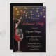 Vidro de vinho elegante e luzes de cordas em fundo preto.