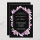 Lindos convites de casamento com uma elegante borda de aquarela roxa e magnólia branca florescem em fundo preto e seus detalhes em letra chica. CORRESPONDENTE a itens na nossa coleção.