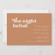 Na noite anterior... Certifique-se de que tudo é perfeito para o grande dia; faça alguns convites modernos para o seu janto de ensaio de casamento. Um tema retro-chic: adote este design tipográfico ligeiramente vintage e na moda para a sua papelaria de casamento, com um tema cor-de-rosa, laranja queimado, terracota, açúcar castanho e pêssego. Texto, cores e fundo totalmente personalizáveis.