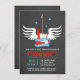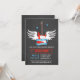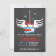 Este na moda, modesto e legal convite para chás de fraldas tem um violão elétrico vermelho flamejante com um par de asas brancas atrás dele. O cartaz ao redor do violão diz "Rock a Bye Chá de fraldas" que é uma surpreendente torção de trocadilhos para uma canção de ninar clássica. As cinzas escuras têm uma design de textura clara. Ao contrário, há um clássico registro vinílico com notas musicais e estrelas para decorações. Este convite é perfeito para qualquer celebração de chá de fraldas de rock and roll, música ou rock star! Personalize facilmente com os detalhes do seu chá de fraldas.