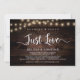 Lindo Nada de Fantasia, Apenas Amor, Anúncio de Casamento às Escuras / Cartão de convite, em Madeira Rústica de Fazenda, design de Luzes de Natal. Isto é perfeito para o seu casamento e festa de celebração pós-casamento. Adicione seus detalhes em fonte / letra correspondente.