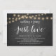 Belo Nada Fancy, Apenas Amor, Anúncio de Casamento com Fuga Romântica / cartão de convite para festa, em Luzes de Corda de Fazenda Rústica Moderna, tema de quadro negro. Isso é perfeito para a sua recepção de casamento e festa de celebração pós-casamento. Adicione seus detalhes na fonte correspondente.