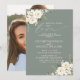 Crie o convite perfeito para um casamento casual, ou para a celebração de recepção após uma fuga romântica, com este design moderno e trendy, com flores de eucalipto e brancas em aquarela, tipografia em letra manuscrita, sobre um fundo verde sage. O design apresenta sua foto favorita no verso do cartão. Entre em contato com o designer para produtos combinando. Muito obrigada por apoiar nosso pequeno negócio, apreciamos muito!