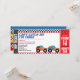 O convite para aniversário de 3 anos de passagem de caminhonete monstros desenhado como um bilhete de admissão VIP com caminhões monstros coloridos e bandeira de controlo.