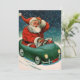 Imagem de Natal com ilustração vintage de um Papai Noel retrô dos anos 50 dirigindo um carro conversível verde fofo na neve! A placa diz Polo Norte!
