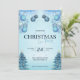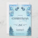 Há bolas de Natal azuis e brancas penduradas de cima, com árvores de Natal exibidas abaixo.