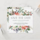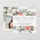 Esses elegantes cartões de Natal de casamento para salvar a data apresentam flores rústicas em aquarela com pinhas, galhos, frutas, folhas e rosas brancas. Sua foto aparece no verso com mais flores.