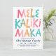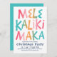 Tema havaiano O convite de festas de Natal apresenta a tipografia "Mele Kalikimaka" em cores tropicais com seus detalhes de evento em azul marinho. Perfeito para comemorações de temas tropicais, praias, litorais e insulares. Arte por KL Stock