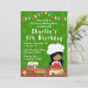 Uma garota africana americana bonitinha com chapéu de chef e um avental vermelho com floco de neve está rolando massa em uma mesa que apresenta doces festivos de Natal assados, como um bolo de Natal com sagrado, cupcake com borrão e biscoitos. Na frente dela está um saco de cachimbo de gelo vermelho e um misturador de mão. Gráficos por PrettyGrafik