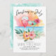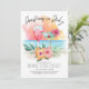 Tema tropical O Natal de julho apresenta um pôr de sol de praia em aquarela, coquetéis, flores de hibisco e folhas de palma com uma legenda de "Natal em julho" em letra de estilo manuscrita. Perfeito para a família de verão se reunir, reuniões, festas de férias antecipadas ou atrasadas, etc.