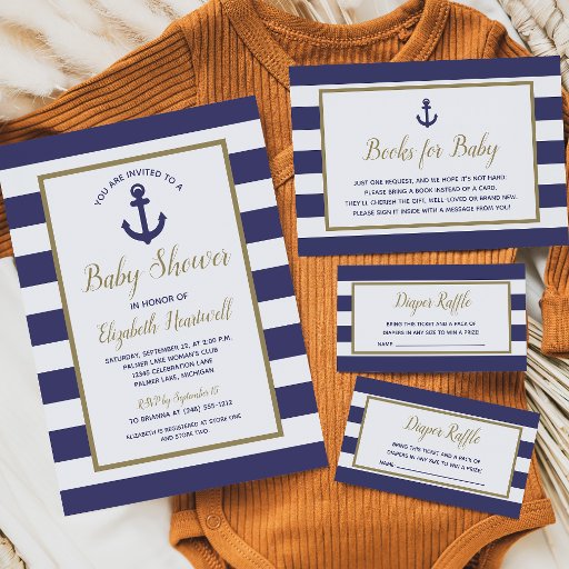 This nautical baby shower invitation features a navy blue anchor and a background of navy blue and white stripes. The words "Baby Shower," the name of the mother-to-be, and the RSVP deadline appear in gold-colored script typography. The remaining text is in navy blue. Ideal for a boy's baby shower!