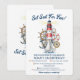 This design shows a tall striped beacon shining over a fun collection of sea items. At the bottom, a small boat floats on gentle water waves. Behind it, you will see a wooden steering wheel, a heavy iron anchor, a floating rescue ring, and a vintage direction finder all tied together with thick rope. The text is a dark blue color and is laid out neatly on the plain white background so everything is easy to read. It is a very cute and simple look for a boy's party near the water.