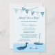 Este menino que 5x7 o chá de fraldas convida tem um tema náutico do marinheiro. Na parte superior, há duas bandeiras bunting que são azuis marinhos e luz - azul. Na parte inferior, há algumas ondas no oceano com um veleiro que flutua na parte superior. Abaixo da água, há uma grande baleia azul com natação de alguns peixes perto. No meio, você pode facilmente personalizar toda sua informação do chá de fraldas. Copyright GraphicMarket