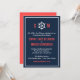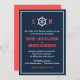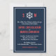 Convite de casamento azul-marinho escuro e coral com uma ilustração de helm branco entre a noiva e as iniciais do noivo. Isso é perfeito para casamentos náuticos temáticos ou casamentos temáticos oceânicos e marinhos.
