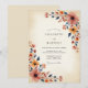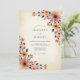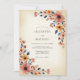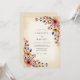 This design features a warm cream backdrop adorned with lush botanical clusters. Vibrant apricot and dusty rose anemones are paired with deep navy blue foliage to create a sophisticated and romantic mood. The painterly style offers a timeless and artistic feel for an elegant seasonal ceremony.