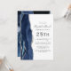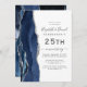 The left-hand edge of this elegant modern wedding anniversary party invitation features a navy blue watercolor agate border trimmed with silver faux glitter. The customizable text combines charcoal gray handwriting, copperplate and italic fonts on a white background. The reverse side features a matching navy blue and silver agate design.