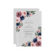 This design features a sophisticated palette of navy blue, dusty rose, and blush pink set against a light gray background. Elegant watercolor roses and anemones are accented by delicate sage green eucalyptus leaves. The arrangement offers a romantic and timeless aesthetic suitable for a formal spring or autumnal event.