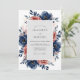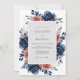 Deep navy blue anemones and dusty rose roses create a striking botanical border. This watercolor design captures a moody yet romantic atmosphere with its rich indigo foliage and muted peach accents. Perfect for a sophisticated autumnal or winter marriage event, the artwork evokes a sense of timeless elegance.