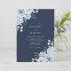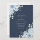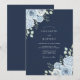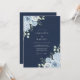 This sophisticated design features a deep navy blue background accented by frosty floral clusters. Icy dusty blue and cream roses are paired with delicate hydrangea blossoms and silver dollar eucalyptus leaves. The cool-toned palette evokes a serene winter atmosphere, perfect for a formal seasonal affair.