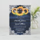 Elegant rustic navy blue floral wedding invitation featuring sunflowers against a wood background adorned with white floral lace and string lights. Ideal card design for a romantic navy blue rustic wedding party inspired by sunflower flowers.