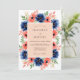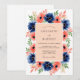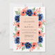 This design showcases a vibrant display of watercolor anemones in striking navy blue and warm coral tones. Lush foliage and painterly blooms surround the central peach background, creating a romantic and artistic mood. Ideal for a summer or spring event, the palette features rich blues and soft greens for a fresh botanical feel.