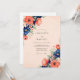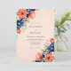 Lush watercolor roses and ranunculus bloom in shades of vibrant coral and deep navy blue. This artistic floral design features a soft peach backdrop complemented by delicate sage green leaves. The painterly style evokes a romantic and elegant mood, perfect for a seasonal outdoor event.