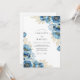A captivating arrangement of deep blue and sapphire blossoms with delicate golden foliage graces this design. Evoking a sense of romantic sophistication, the floral imagery creates an enchanting and luxurious atmosphere. This artful composition is perfect for a memorable occasion.
