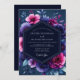 Experience a dramatic and moody ambiance with this artistic floral design. A deep navy background sets the stage for a luminous bouquet of magenta, fuchsia, and purple anemones. Touches of teal foliage add depth to the opulent and romantic arrangement. This elegant botanical composition is perfect for an evening affair.