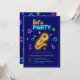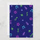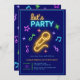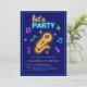 Elegante convite de aniversário com microfone amarelo neon e notas coloridas de música no chão preto azul escuro.