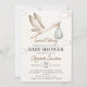 Celebrate your baby's arrival with our charming, gender-neutral baby shower design, featuring a classic white stork flying over a soft, light brown sky, carrying a sweet baby. Perfect for a boy, girl, or surprise shower, this elegant and minimalist design adds a warm and timeless touch to your event. For complementary elements, see our collection of this lovely design.