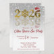 This elegant illustration features the year 2026 in shiny golden typography. The zero is replaced by a detailed gold snowflake, while the final number is decorated with a red Santa hat. The design has a luxurious and festive appearance, making it ideal for a New Year 's Eve Party invitation.