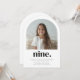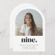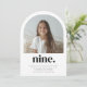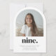 Um simples convite para o 9º aniversário, com sua própria foto em forma de arco e as palavras 'nove' embaixo. Você pode adicionar sua própria foto rápida e facilmente nesta design.