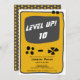 Uma festa divertida e divertida de aniversários de criança, perfeita para videogame e jogador de console com uma caixa fofa de um jogo de vídeo em amarelo editável e cor de cinza e padrão de pixels quadrados no verso.