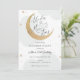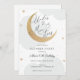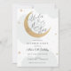 Convite de aniversário com nuvens de aquarelas e estrelas de ouro com lua reluzente e roteiro divertido "Sob a Lua e Estrelas!" Personalize com suas informações ou clique em "clique para personalizar mais" para ajustar o tipo de fonte, o tamanho e a cor.