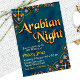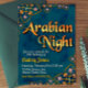 Entre num mundo de mistério e encanto nesta convite de Noite Arábica. Este convite foi feito especial usando uma cor de fundo cativante com decorações douradas e de diamantes para capturar a vibração e o encanto de uma festa temática árabe