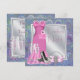 Vestido de festa rosa prata, sapatos de salto alto champanhe, bolsa de cetim, convite de festa rosa.