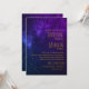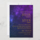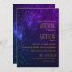 Douradas manchas astrais, dando a impressão de estrelas no céu, brilham acima das palavras sobre um fundo roxo. Um tema moderno para um convite de casamento na moda. Altere facilmente as informações para o seu próprio design personalizado.