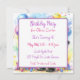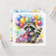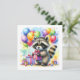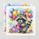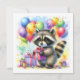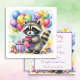 O convite de aniversário do Raccoon para uma menina. Docinho guaxinim com um presente de aniversário cercado por balões de aniversário em azul, amarelo, verde, roxo e rosa.