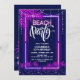 Convite de aniversário para festas de praia em roxo e marinho com a estrutura do neon, palmeiras e luzes de cordas.