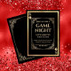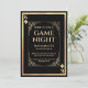 Este convite de festas da Noite de Jogo apresenta um clássico design de cartas de jogar em um fundo preto. Um quadro de estilo de vintage e ornamentado envolve a área de texto central. Um quadro de design de folha de ouro correspondente borda o convite. Dois diamantes de ouro e o monograma rei são impressos em cantos opostos, semelhantes ao layout de um baralho.