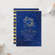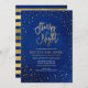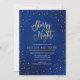 Convite de dança escolar elegante com uma borda de estrelas e as palavras "Noite Estrelada" em folha de ouro falsa contra um vibrante fundo de aquarela azul que é perfeito para baile de formatura, dança de recepção, etc. O cartão tem um padrão de listras de folha de ouro falsa contra um fundo de aquarela azul no verso.