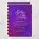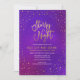 Convite de dança escolar elegante com uma borda de estrelas e as palavras "Noite Estrelada" em folha de ouro falsa contra um fundo vibrante de aquarela roxa, perfeito para baile de formatura, dança de boas-vindas, etc. O cartão tem um padrão de listras em folha de ouro falsa contra um fundo de aquarela roxa no verso.