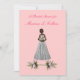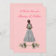 Esta design apresenta uma linda noiva afro-americana/negra em um lindo vestido branco. O fundo é de um rosa pastel, e dois buquês de lírio rosa estão em seus pés. Personalize para atender às suas necessidades.